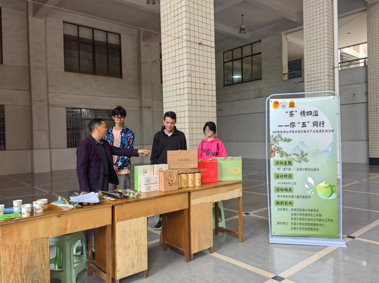 为助力我校乡村振兴帮扶点永顺县五官村莓茶产业发展,促进当地莓茶产品对外宣传、品牌建设和销售提速,4月11日,学院和8858cc永利官网市场营销协会在砂子坳校区联合启动以“茶情四溢,你‘五’同行”为主题的2024年助力永顺县五官村莓茶产业发展系列活动。4月11日至13日,第一个品牌活动“‘茶’缘千里——五官村莓茶品鉴会”成功举行。